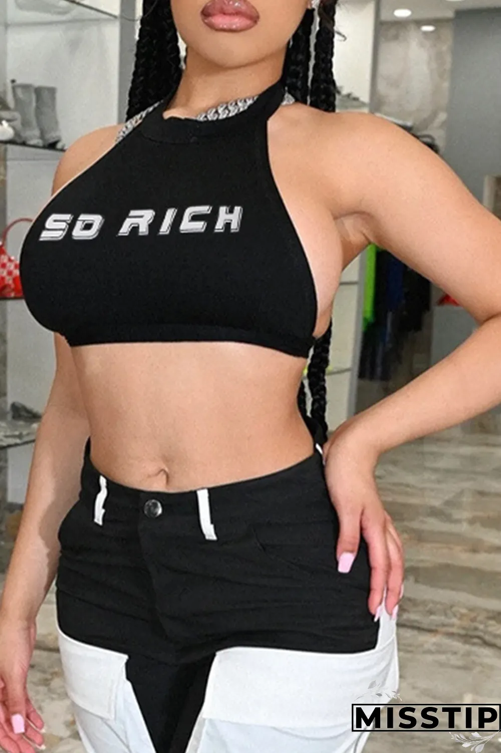 | Product Name | Black Casual Print Letter Halter Tops |